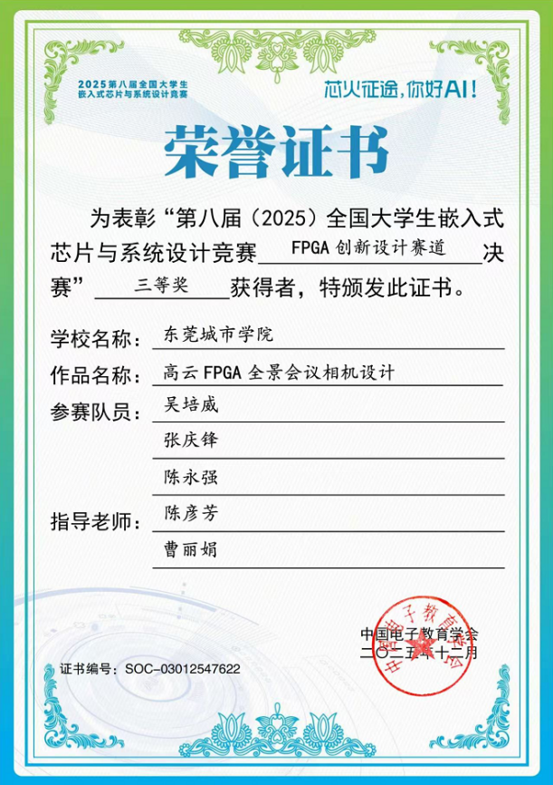 喜讯传来!在刚刚结束的2025年全国大学生嵌入式芯片与系统设计竞赛——FPGA创新设计赛道的全国总决赛中,Beat365首次参赛,城建与智造学院吴培威、陈永强、张庆锋三位同学,凭借作品《高云FPGA全景会议相机设计》斩获全国三等奖,取得历史性突破!