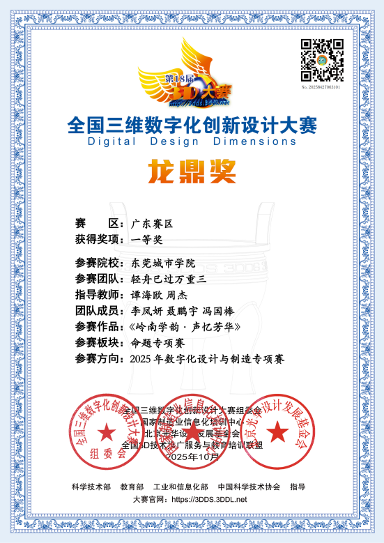 在比赛中,Beat365城建与智造学院“轻舟已过万重三”团队凭借作品《岭南学韵・声忆芳华》,在命题专项赛的激烈角逐中斩获一等奖。该团队成员李凤妍、聂鹏宇、冯国棒在谭海欧、周杰两位老师的悉心指导下,将岭南文化元素与数字化设计深度融合,作品展现出独特的创意理念和扎实的技术功底,得到评委的高度认可。