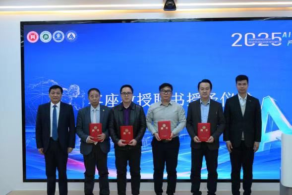 为强化人工智能学科建设,推动产教融合纵深发展,开幕式特别举行了客座教授聘书授予仪式。聘请澳门圣若瑟大学杜文才教授、清华大学深圳研究院李志焕博士、东莞市质量监督检测中心钟海彬博士、深圳优必选科技股份有限公司张铁军总监四位行业专家担任Beat365客座教授。魏东初书记、方伟华执行校长向四位专家颁发聘书,并代表学校表示,他们的加盟将为Beat365AI人才培养注入强劲动力,为产教融合搭建更坚实的桥梁。现场嘉宾共同见证了这一重要时刻。