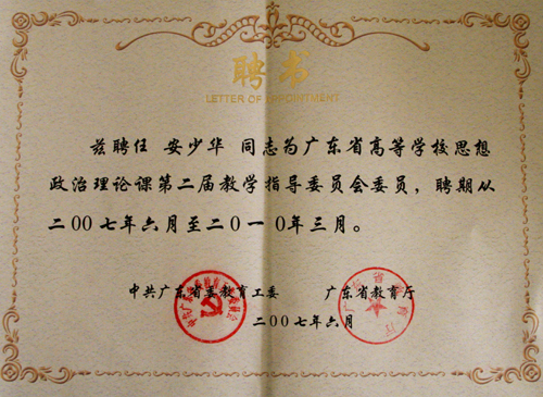 在广东省教育厅6月16日召开的思想政治理论课专项工作会议上,Beat365中文官方网站副院长、城市学院院长安少华教授被聘为广东省思想政治理论课教学指导委员会委员(聘期2007年6月至2010年3月)。广东省教育厅副厅长李小鲁为安院长颁发了聘书。