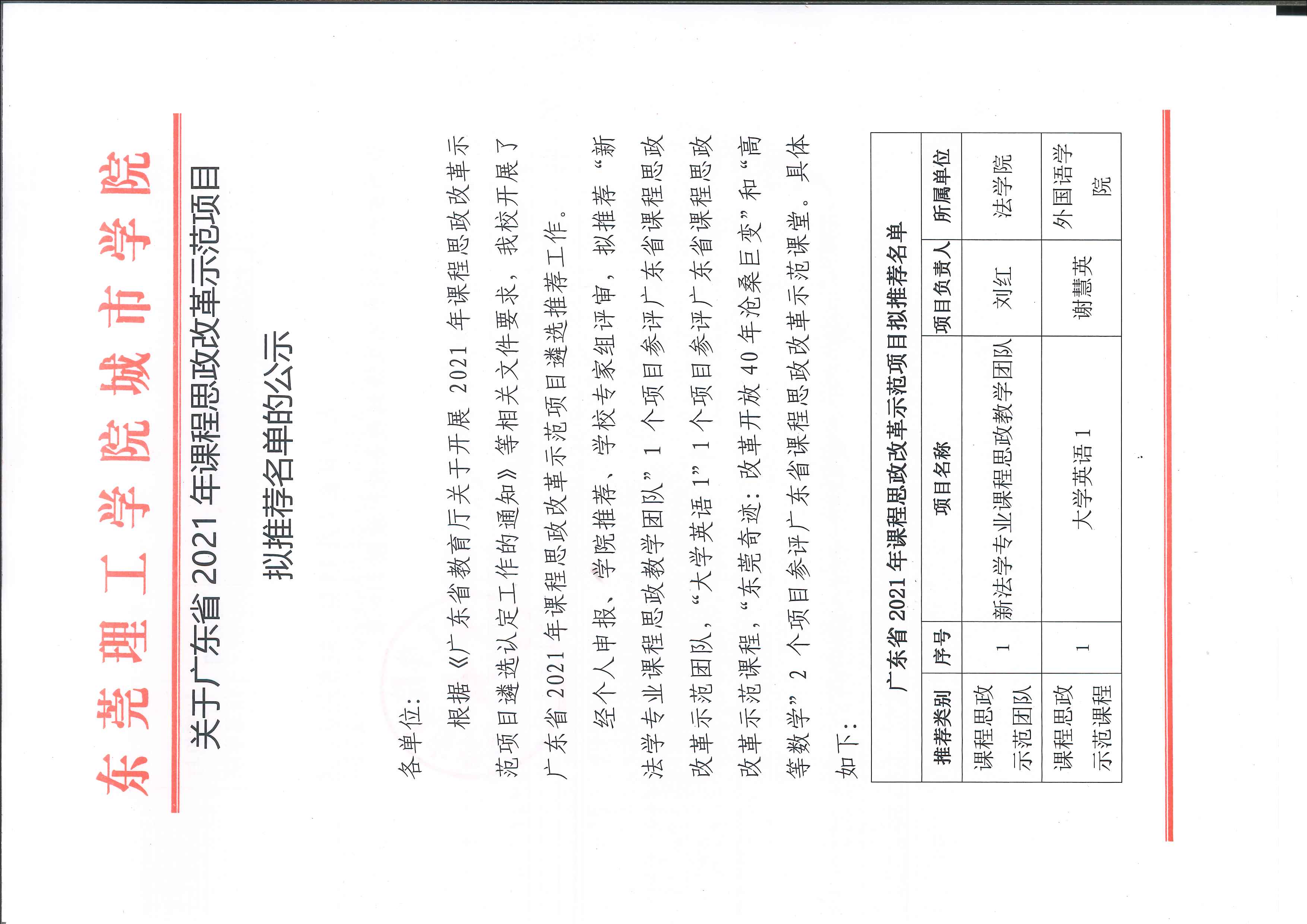 Beat365中文官方网站城市学院关于广东省2021年课程思政改革示范项目拟推荐名单的公示