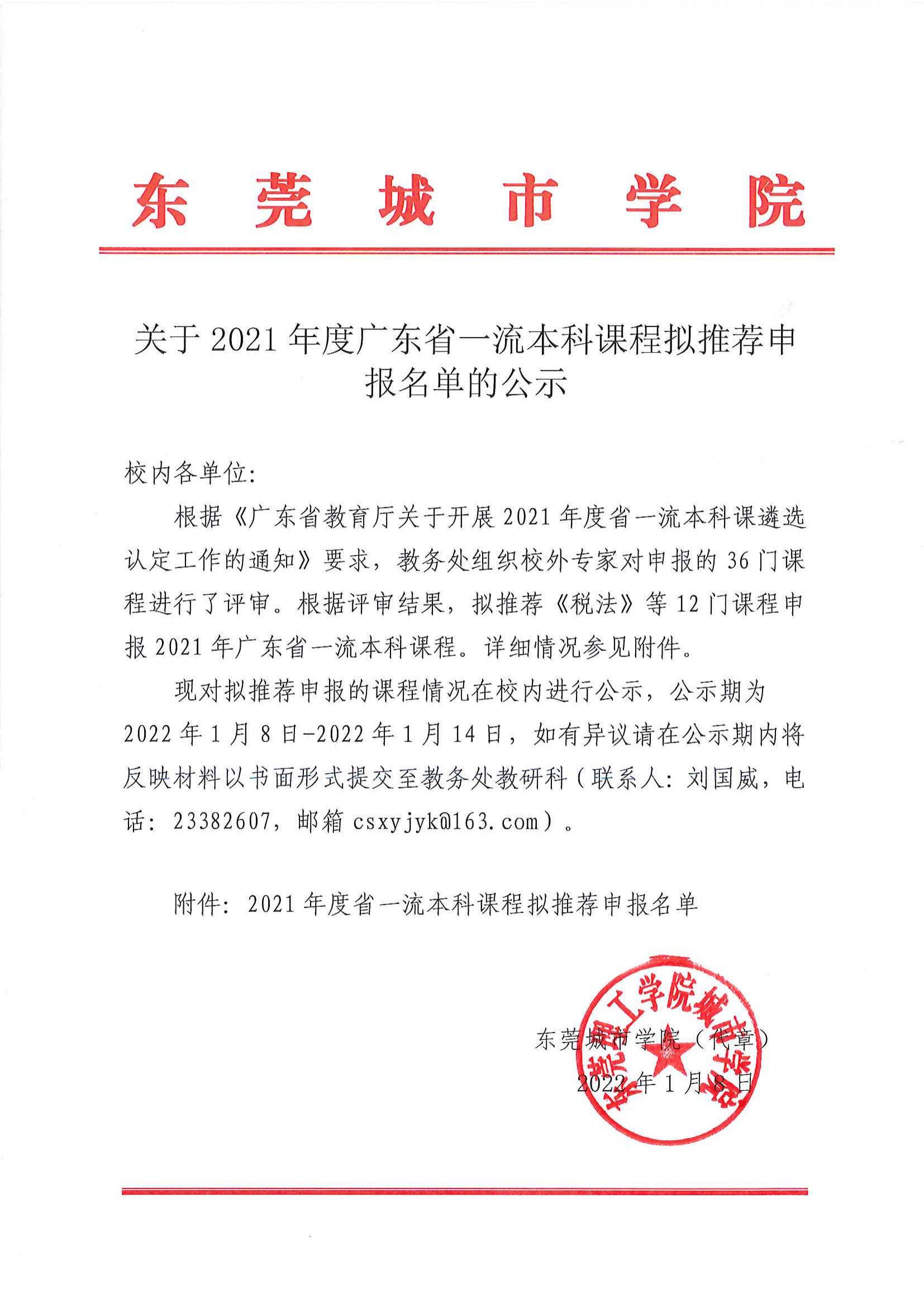 关于2021年度广东省一流本科课程拟推荐申报名单的公示